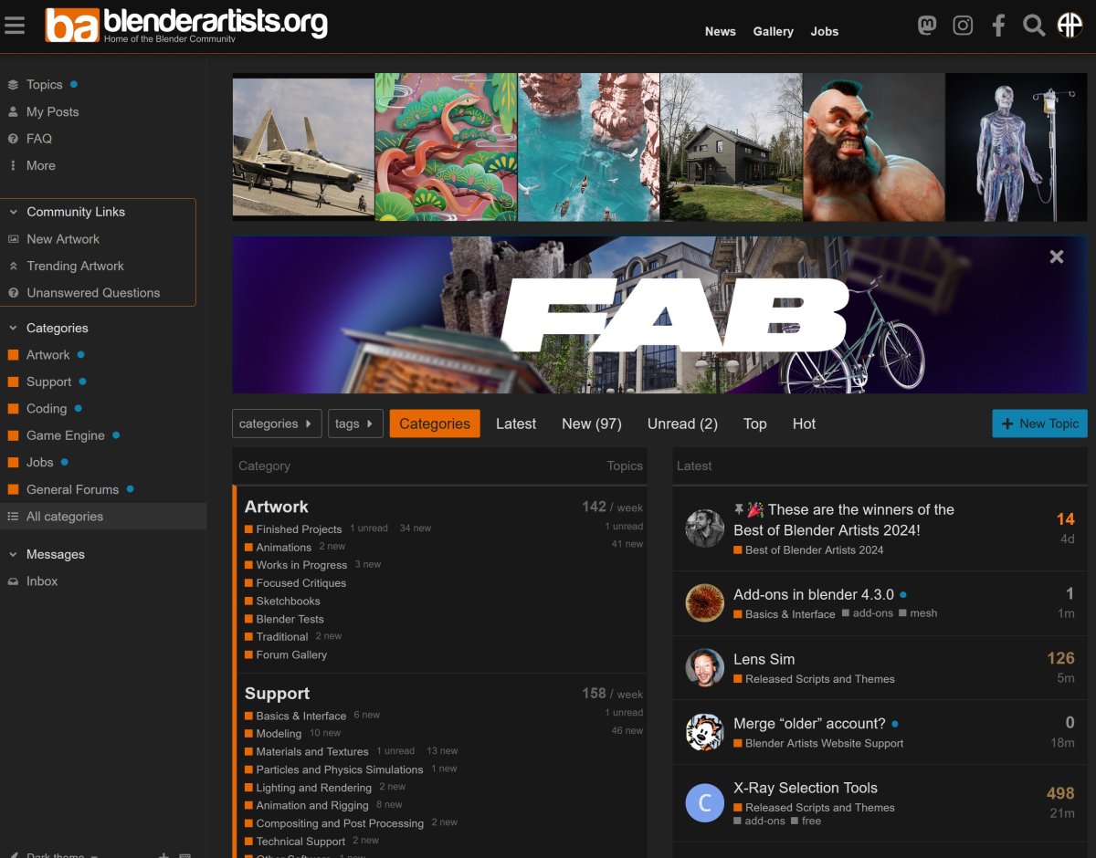 - Le forum est divisé en plusieurs sections, notamment des tutoriels, des astuces, des offres d'emploi et des discussions générales sur Blender. Il existe une collection de tutoriels, d'astuces et de conseils partagés par la communauté, ainsi que des offres d'emploi, rémunérées ou bénévoles. Les publications dans la catégorie "Promotions" reçoivent une promotion supplémentaire sur le site.