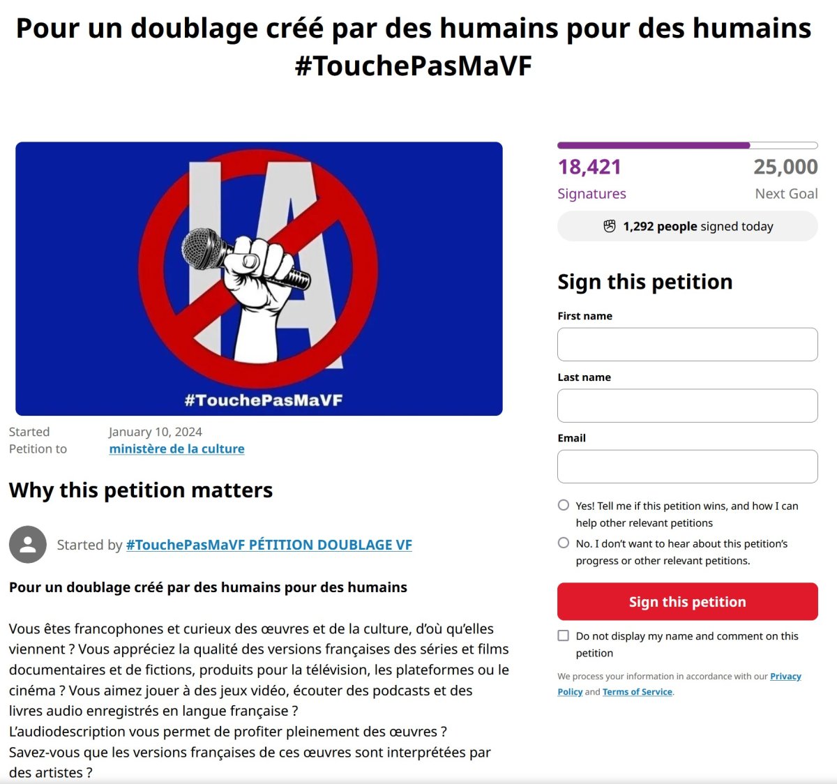 Pour que les voix et doublages continuent d’exister dans le respect des données personnelles et les activités de ces professionnels du son et de l’image. Une pétition qui vaut ce que vaut une pétition, mais je trouve qu’il est bon de savoir ce qu’on veut et pas seulement ce qu’on peut faire.
