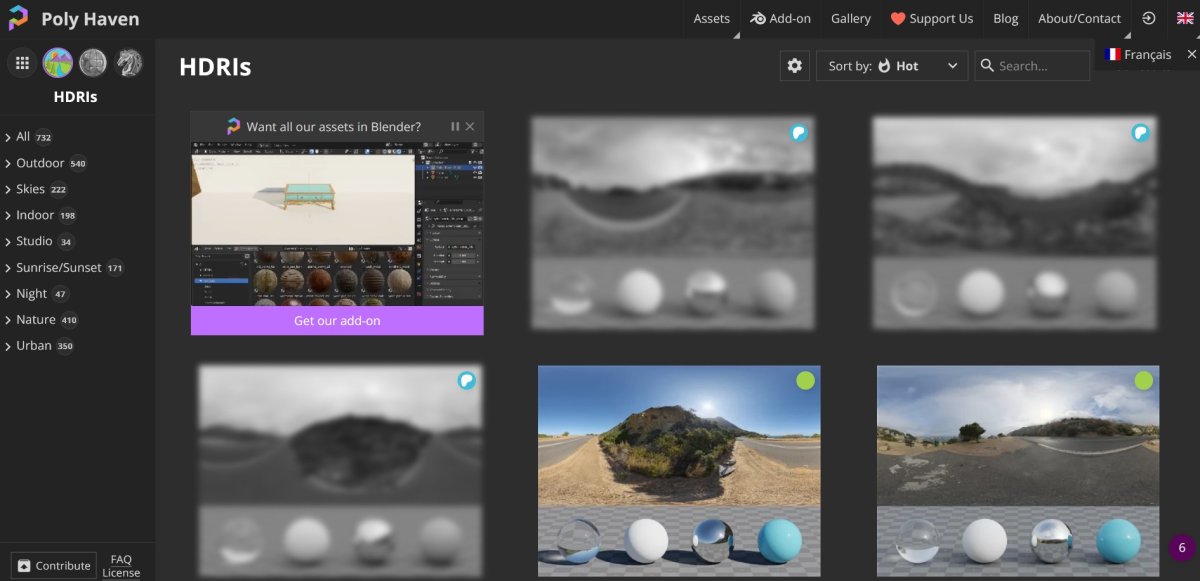 Poly Haven propose des textures HDRI gratuites ainsi que des modèles 3D. Ce site est soutenu par des dons et offre une large gamme de textures de haute qualité pour divers environnements, idéales pour les artistes 3D et les développeurs de jeux.