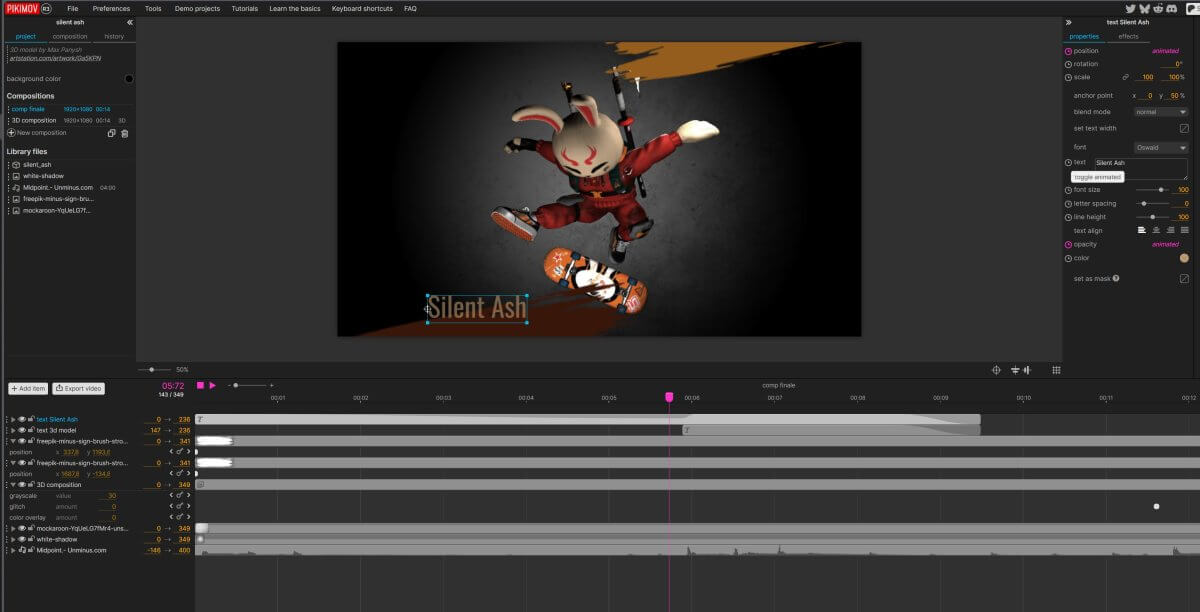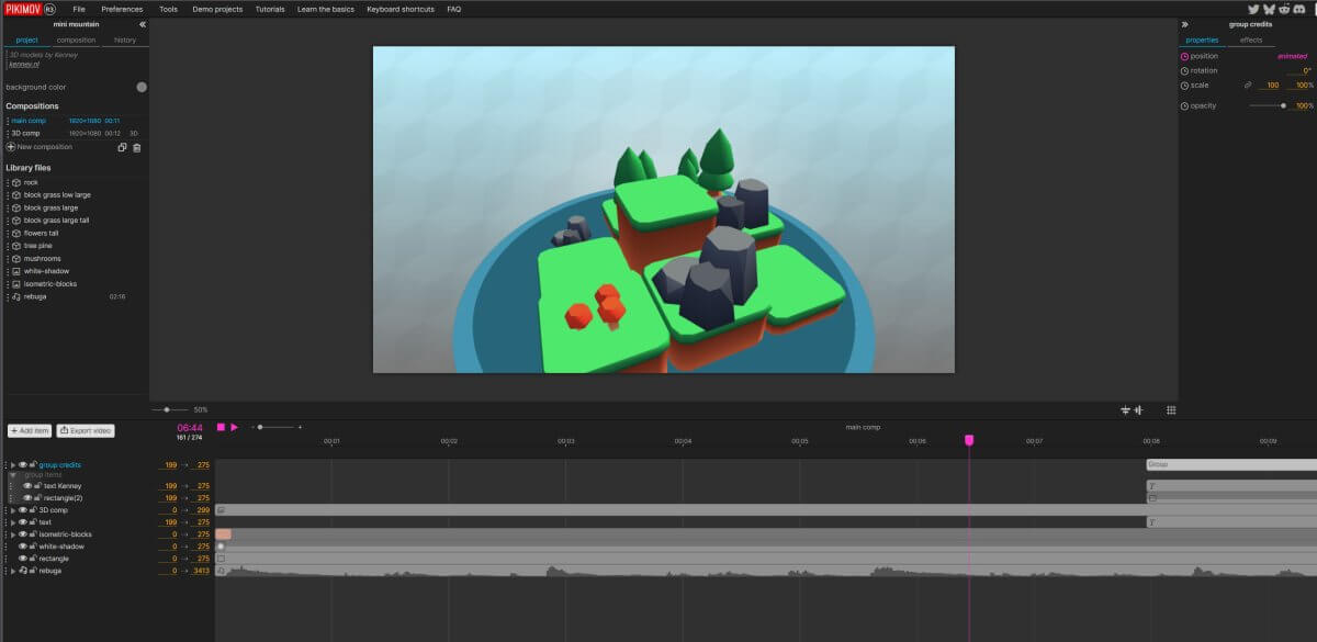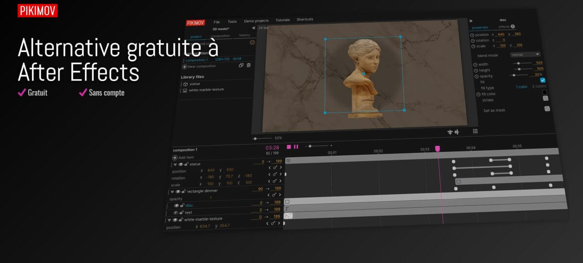 Pikimov offre la possibilité d'animer, d'effectuer du montage, de composer des scènes, d'appliquer des effets, d'intégrer du son, et même d'importer des modèles 3D (enGlb)...