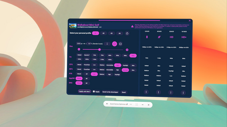 Anagan79 : Il n'y a pas de magie, juste de l'optimisation. On récupère la main sur ce que Meta nous cache : les fréquences d'horloge CPU/GPU, la résolution de rendu et le taux de rafraîchissement. On libère les pixels pour des expériences plus belles, pas de cinétose (mal des transports en VR), et plus agréables encore. Et ce qui me plait avant tout, c’est de voir les visages et sourires des utilisateurs qui me remercient.