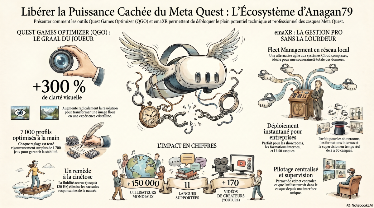 Anagan79 : C’est simple : je n’aime pas le gâchis technologique. Mon parcours m’a appris que la performance ne vaut rien sans stabilité. Quand j'ai vu que Meta bridait ses casques pour lisser l'autonomie, mon instinct de développeur a pris le dessus. C’était aussi une suggestion de Gamergen avec qui je rédigeais des articles. Mes outils, que ce soit QGO ou EmaXR, sont construits comme des infrastructures robustes, prévisibles et ne jamais faillir, même quand l'OS de Meta change de version tous les mois.