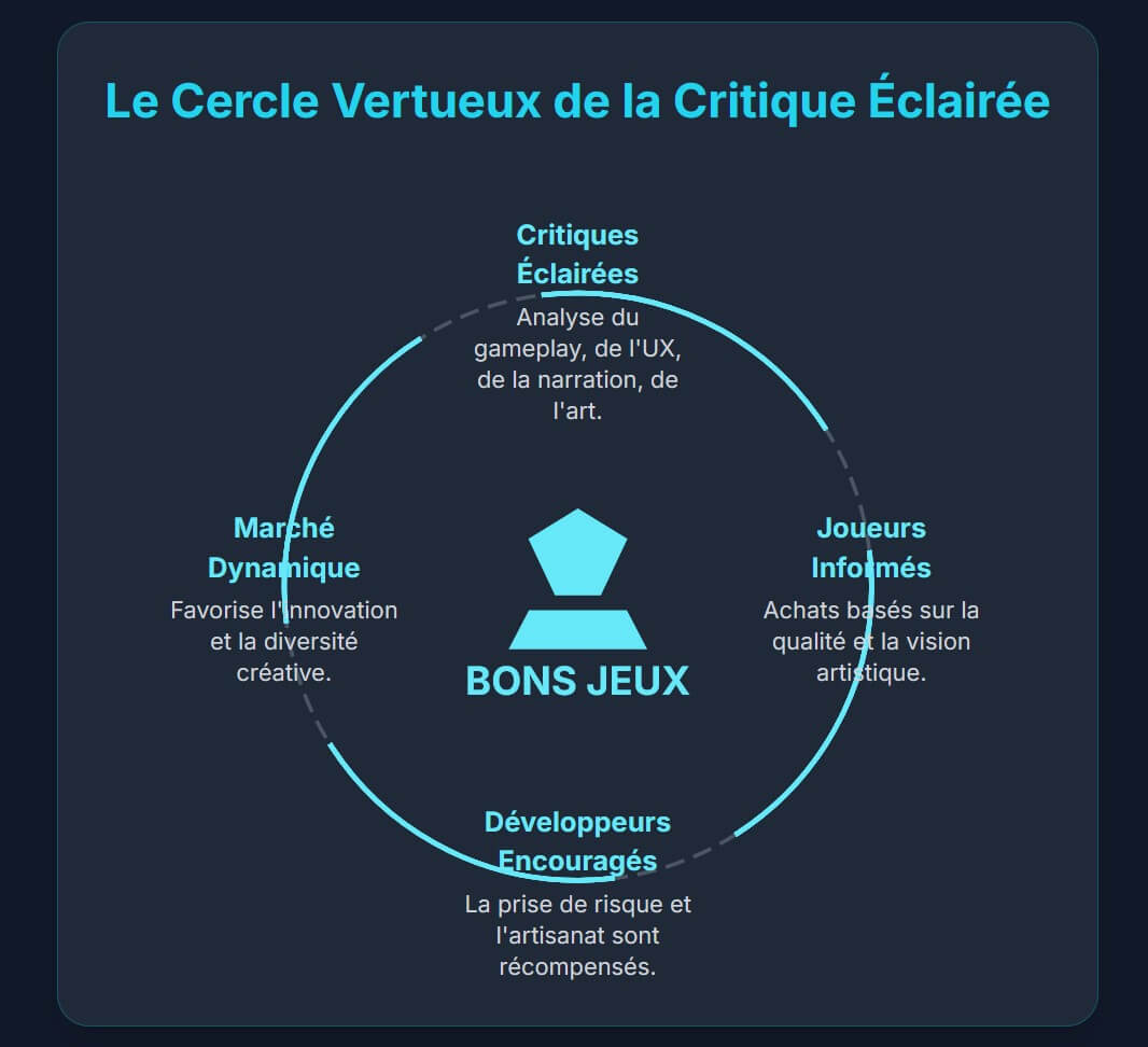 Mais au-delà de l'enrichissement personnel, il y a un enjeu collectif. Un public éduqué aux complexités du développement de jeux est plus à même d'exiger et de soutenir une critique de haute qualité et approfondie. Si les joueurs comprennent ce qui constitue une bonne conception de jeu, une UX réussie ou une narration percutante, ils seront moins enclins à se satisfaire de critiques superficielles qui ignorent ces aspects.