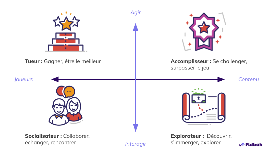 Tous les utilisateurs ne réagissent pas de la même manière aux stimuli gamifiés. Il est donc essentiel de concevoir des expériences qui s’adaptent à différents types de joueurs. L’une des typologies les plus couramment utilisées est celle de Bartle, qui identifie quatre grands types de joueurs :