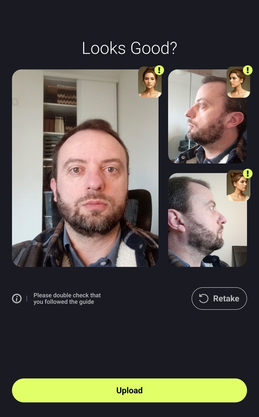 - Pour créer un avatar réaliste, vous devez prendre trois photos de votre visage : une de face et deux de profil.